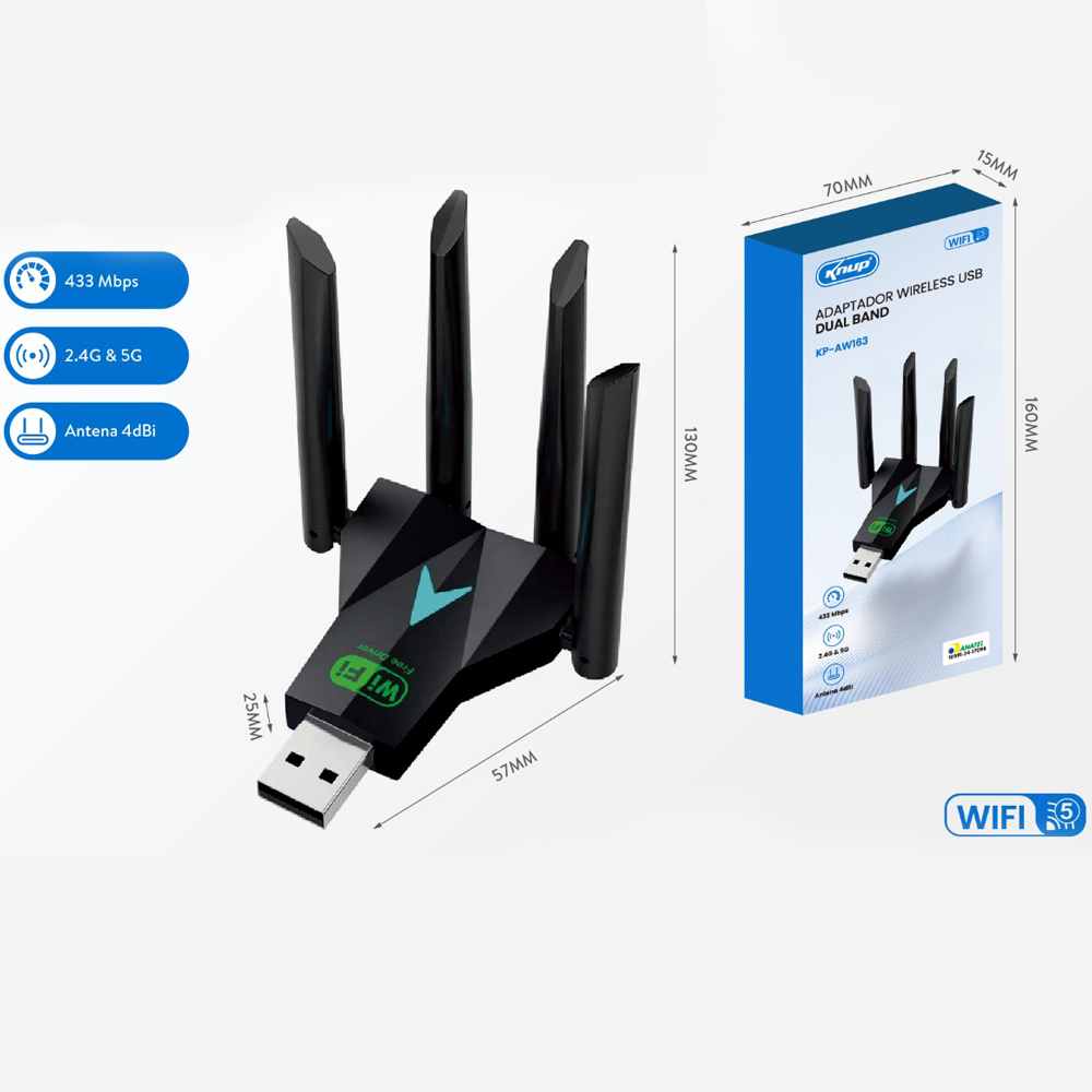 • USB 2.0, 2dBi • Velocidade: 600Mbps • Frequência: 2,4G-5,8G