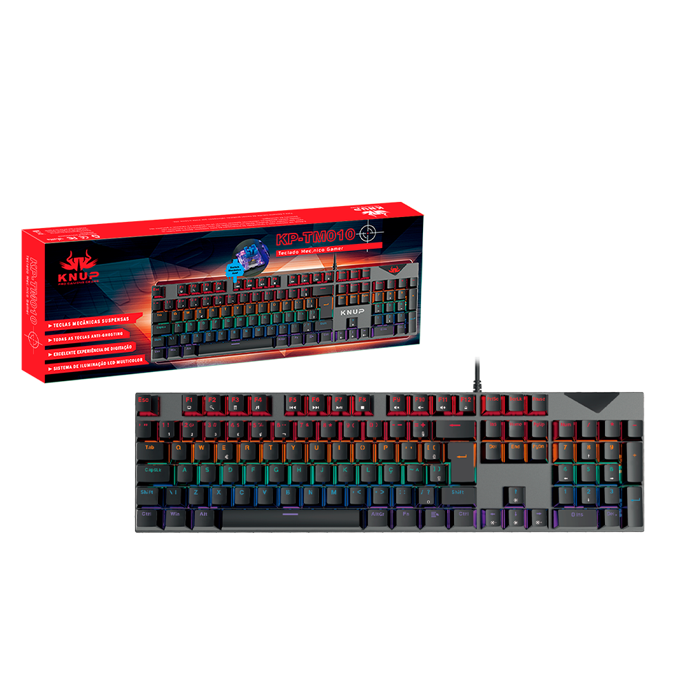 • Todas as teclas Anti-Ghosting • Iluminação LED Rainbow Lighting • Teclas mecânicas suspensas • Conexão: USB • Plug and Play
